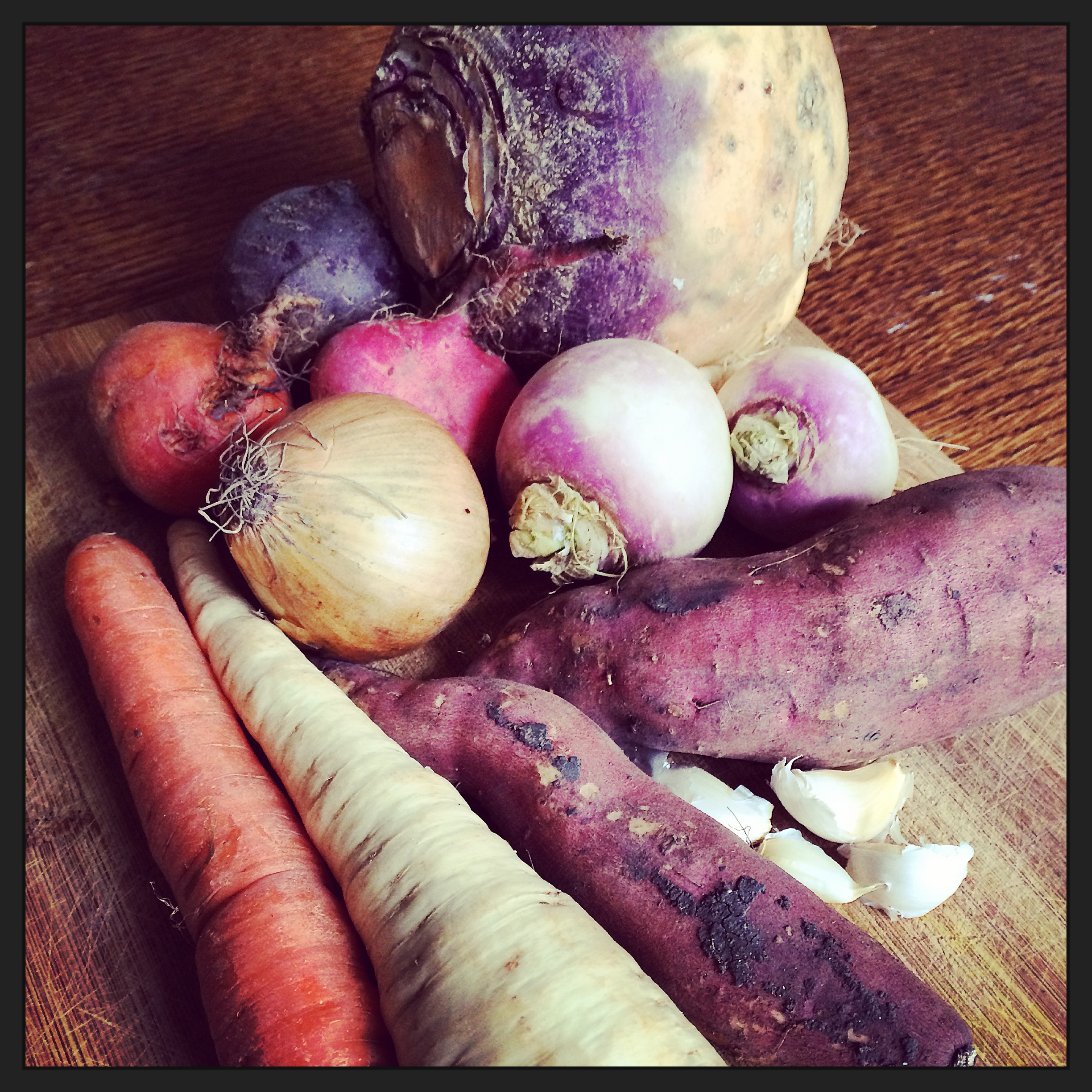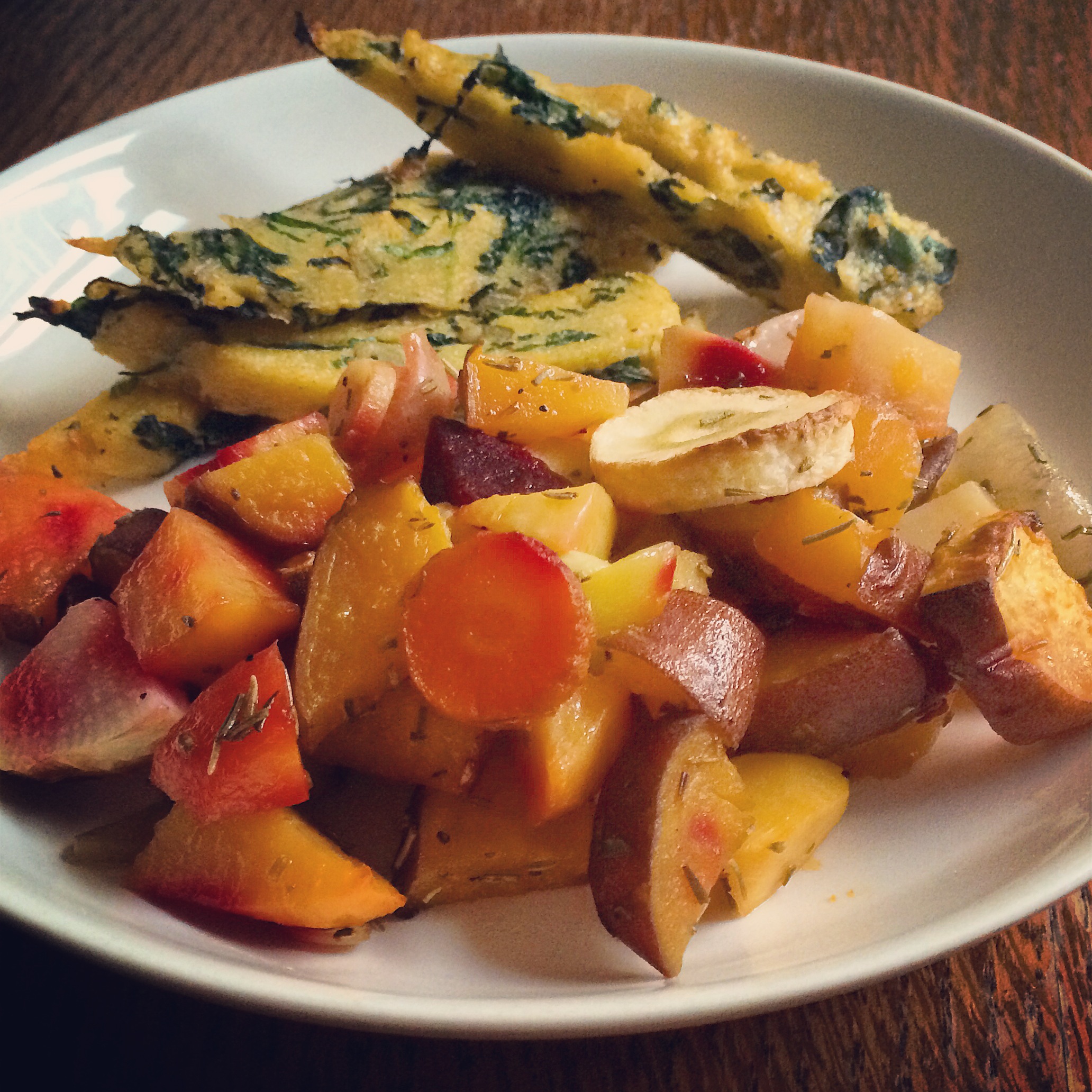 Verwarm je oven voor op 200 graden en snijdt ondertussen de groenten in even grote stukken, zodat ze tegelijkertijd gaar zullen zijn. Als je groenten biologisch zijn hoef je raapjes niet te schillen, de schil van de koolraap verwijder je liever wel. Ook de bietjes schil je. Vermeng met een flinke scheut olie, zout en de kruiden zodat alle groenten bedekt zijn en spreid ze dan uit op een bakblik of in een grote ovenschaal. Bak ze gedurend 40 minuten en draai ze halverwege om zodat ook de onderkant roostert. Ze zijn klaar als ze lichtbruin en zacht zijn.Dit gerecht is heerlijk met een stevige linzensoep (dal) en geroosterde polenta.