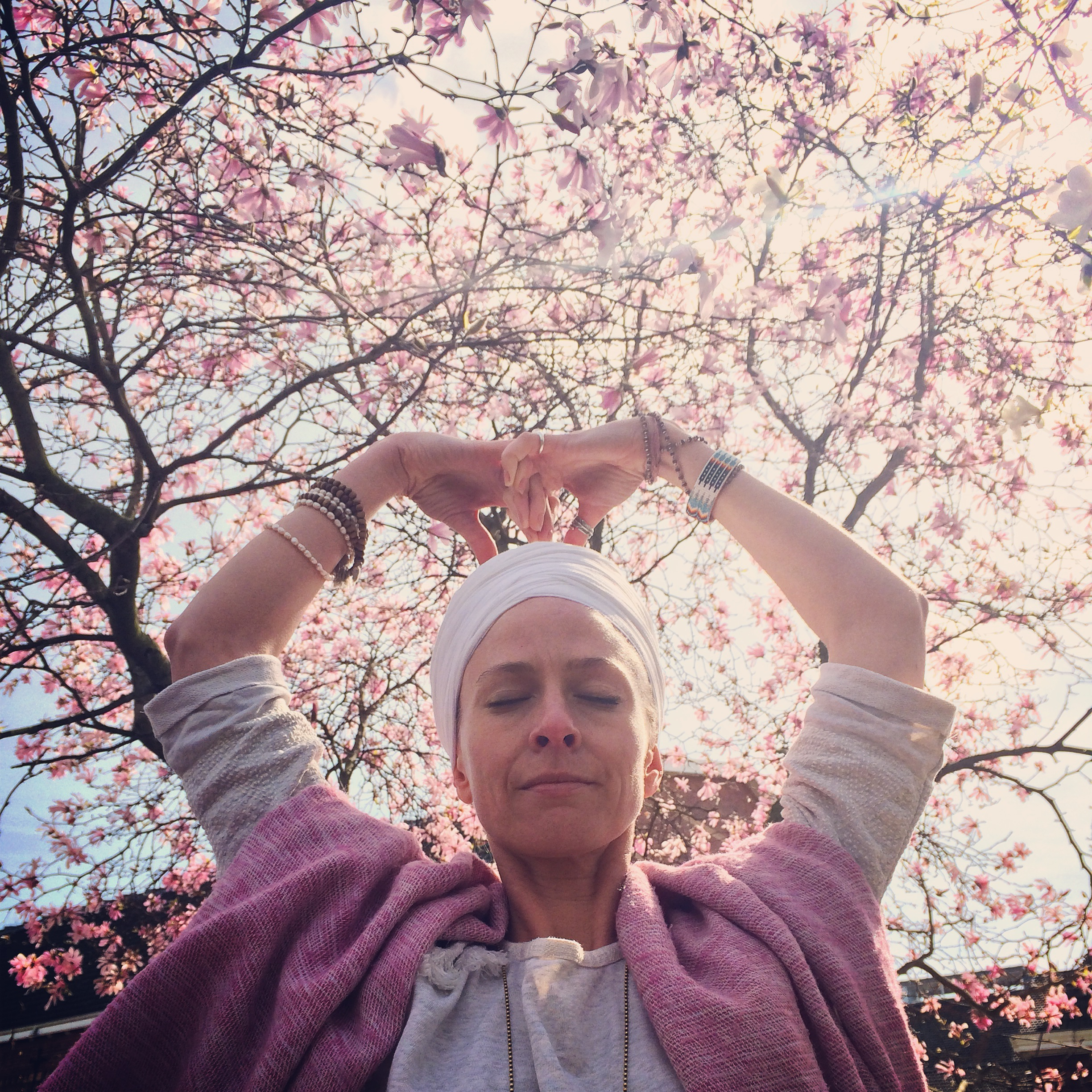 Mudra: Maak een cirkel met je armen boven je hoofd en verstrengel de vingers in elkaar tussen de handpalmen, zorg dat de vingertoppen elkaar raken. Trek je handen wat naar achteren en beneden zodat ze recht boven je achterhoofd komen. De duimen zijn los en wijzen naar beneden. In deze houding chant je de onderstaande mantra voor 11 tot max. 22 minuten.