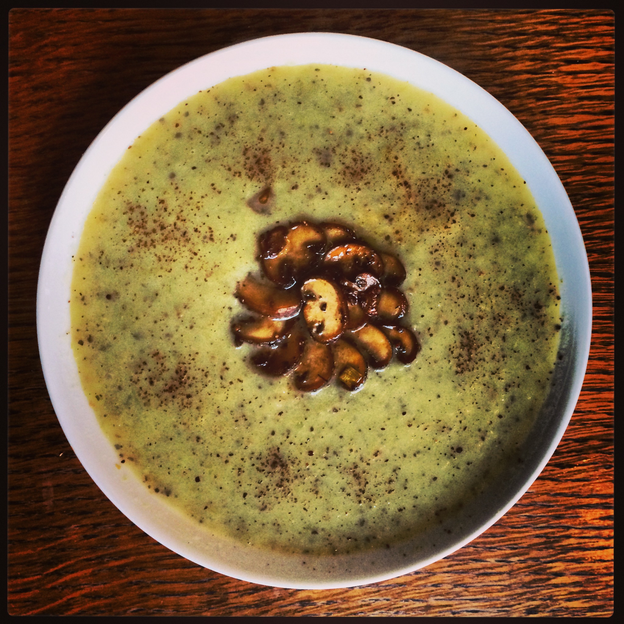 9. Garneer in je bord/kom met de champignons en bestrooi met nootmuskaat